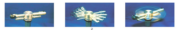 2、普通压缩空气从入气口进入,从喷嘴两端的喷口喷出,同时喷头以600Rpm的转速旋转,产生斜向下的旋转运动的吹出气流,大大增强了气流的吹除作用。